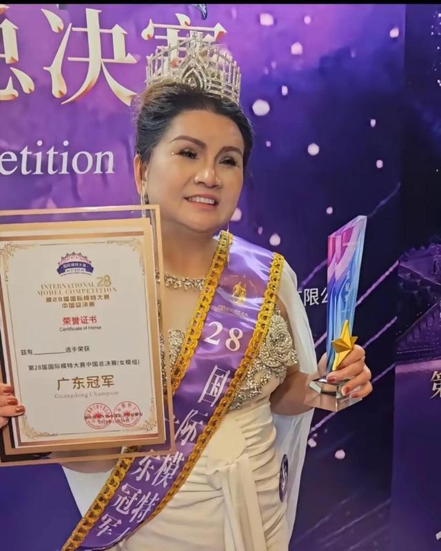 授带上清清楚楚写着“28届国际模特大赛广东冠军”。