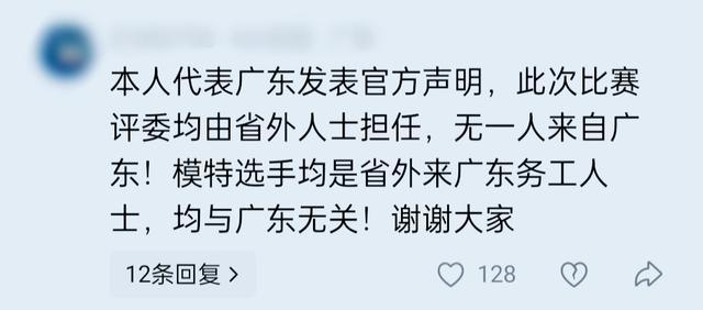 还有人觉得这样的赛事太丢人,不要给广东抹黑,干脆代表广东发言,说评委和模特都来自外省,把自己省撇的干干净净。
