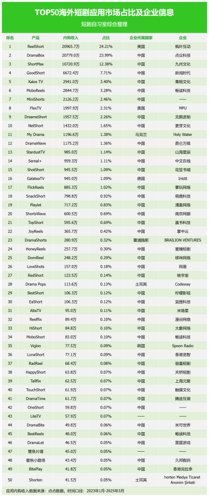 而据短剧自习室统计,全球约431个短剧应用,内购收入前50名应用占据98.45%市场份额。在这50个应用中,40个由中国企业开发,占比高达80%。这意味着,中国开发的平台为海外短剧市场贡献了68.75%的内购收入,海外本土平台仅分得29.58%的市场份额。