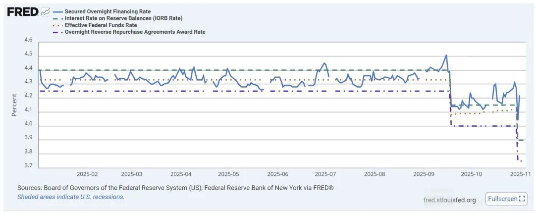 美联储通过 IORB 和 ON RPP 基本能保证把 EFFR 控制在这两个利率之间。这三个利率本质都是美联储利率管控目标的官方体现。