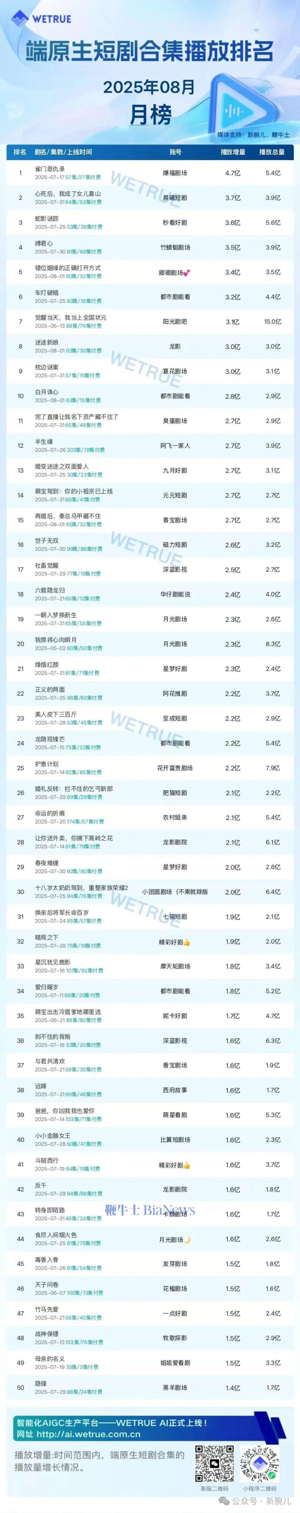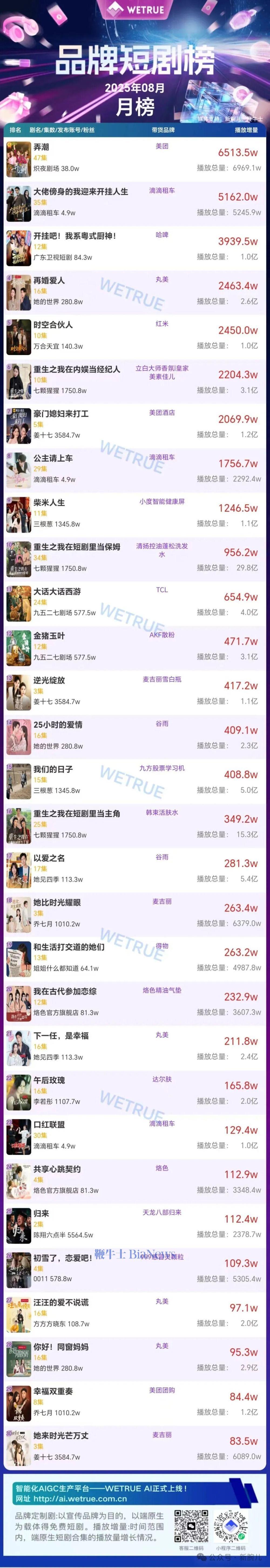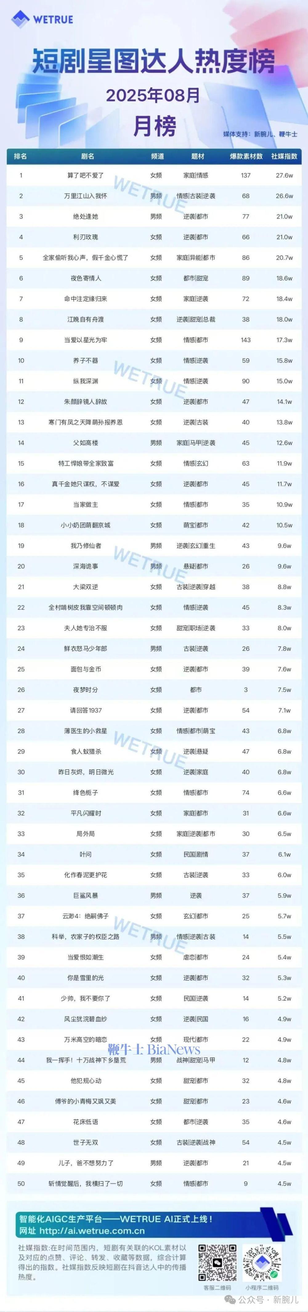 9月4日,新腕儿联合WETRUE一点查剧推出2025年8月的短剧月榜。