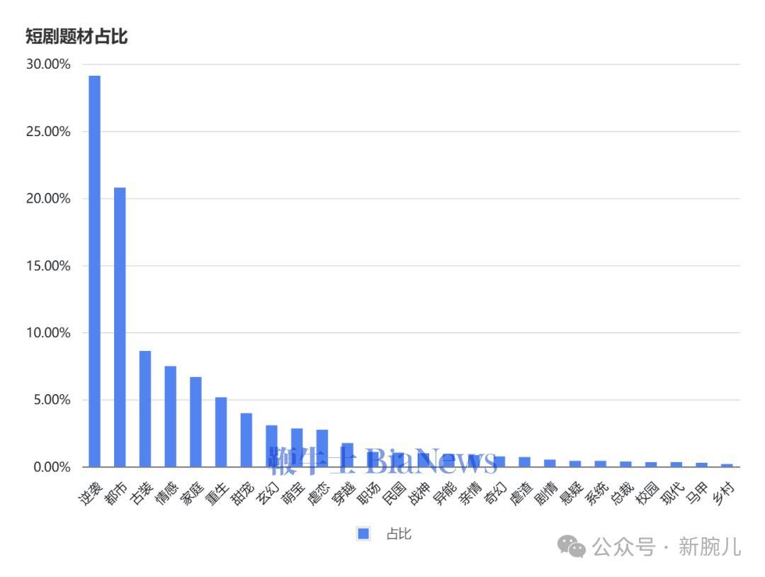 题材类型维度:逆袭、都市、古装、情感等传统题材仍占据市场大部分占比。