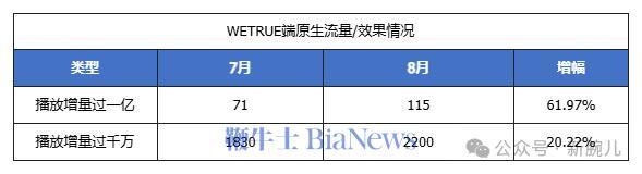 再看端原生的播放效果。7月份累计播放增量过1亿的短剧有71部,到了8月,增加61.97%后,总量为115部;而播放增量过千万的短剧7月有1830部,到了8月份增加20.22%,为2200部。