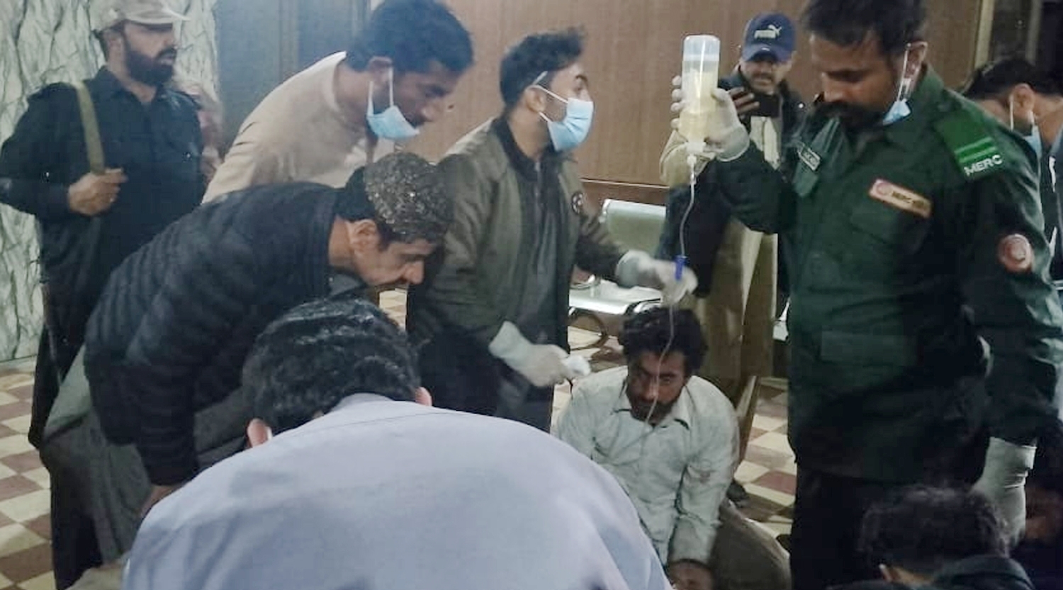 3月11日,在巴基斯坦俾路支省首府奎达,火车遭劫持事件一名获救人员接受救治(手机照片)。新华社发