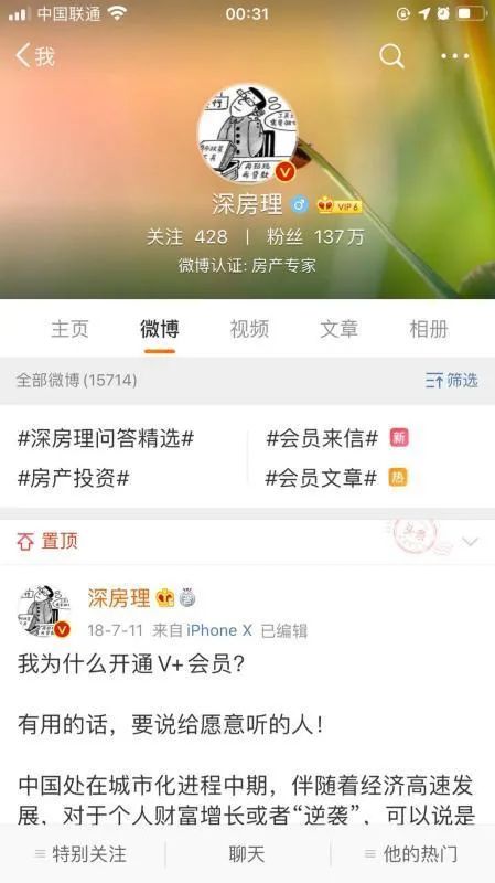 关于后者的咨询方式,仍以“深圳X子”为例,专属咨询1888元/年,此外还有两个咨询渠道:一是微博提问,价格388元,问一个问题,不接受反复私信追问;二是微博V+会员,1688元/年(1088元/半年),权益是可以免费看所有微博会员文章和微博问答,另外有微博群讨论。