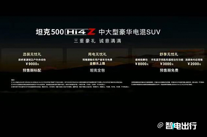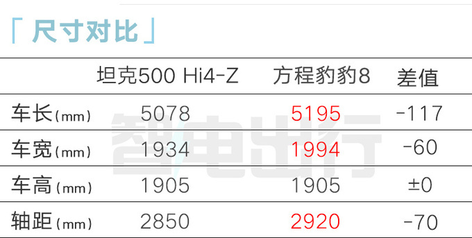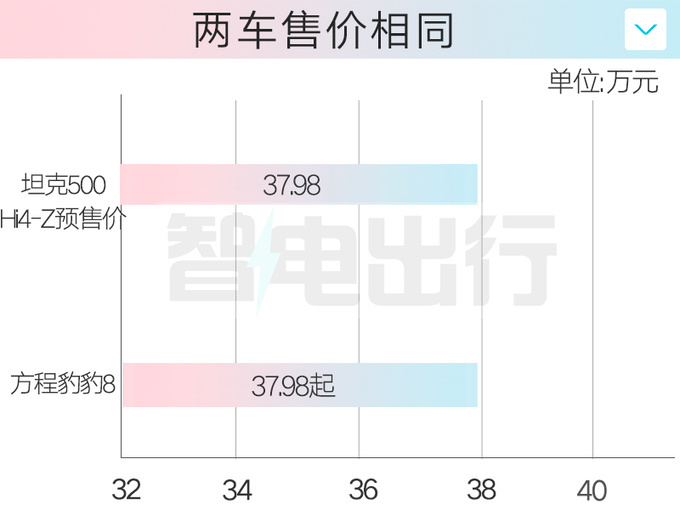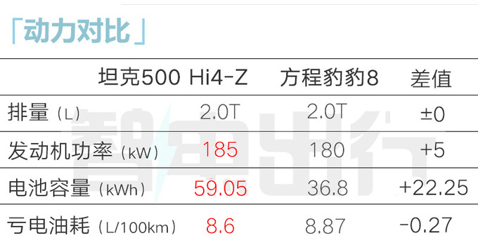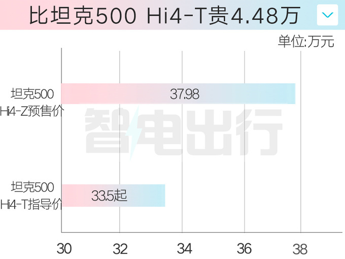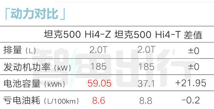 坦克500 Hi4-Z预售价37.98万,比Hi4-T版贵4.48万。新车换搭59.05kWh三元锂电池组,纯电续航里程提升至201km(坦克500 Hi4-T电池容量37.1kWh,WLTC工况纯电续航110km),采用解耦四驱,取消传动轴,越野能力略弱于Hi4-T版。