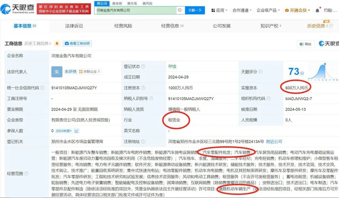 首先,通过天眼查发现,工商登记信息显示,河南金鱼汽车有限公司成立于2024年,位于河南省郑州市,是一家以从事租赁业为主的企业。注册资本1000万,实缴资本600万。从经营范围看,公司此前基本集中在汽车销售、租赁等。汽车零部件及配件制造、机动车辆生产应该是后面增加上去的。