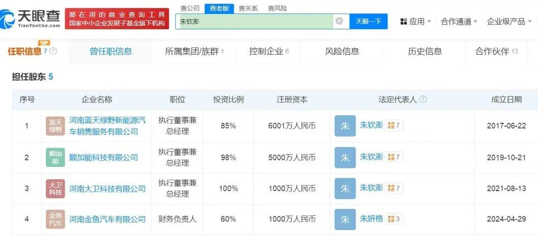 天眼查还显示,朱钦澎名下存续4家公司。除金鱼汽车和顺加能科技外,还有一家汽车销售公司和河南大卫科技有限公司。大卫科技是朱钦澎2022年从农业生物公司全资收购的。大卫科技主业农药批发零售,也有农药消毒剂生产的经营许可。