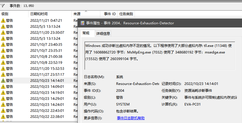 另外,虚拟内存不足也会导致游戏崩溃,有时会弹出对话框提醒你虚拟内存不足,更多时候是直接崩溃,有了事件查看器我们就能在游戏崩溃的时间点准确定位问题。同样是《神秘海域:盗贼遗产合集》在运行过程中,事件查看器记录到了虚拟内存不足的情况,虽然这主要是因为小编忘记关闭Edge浏览器导致的,但为了让游戏稳定,我们可以选择增加虚拟内存。
