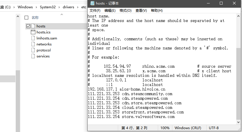 修改DNS的方法比较简单,但不一定能够解决DNS污染导致的登录失败,并且由于使用了国外的DNS服务器后可能会导致一些网页的解析速度变慢,如果遇到这种情况,可以换用修改Hosts文件的方法。首先打开文件资源管理器,进入C:\Windows\System32\drivers\etc文件夹,接着找到hosts文件并以记事本方式打开它,在文件的后面添加上以下7个网址并保存(本方法不适用打开Steam社区)。