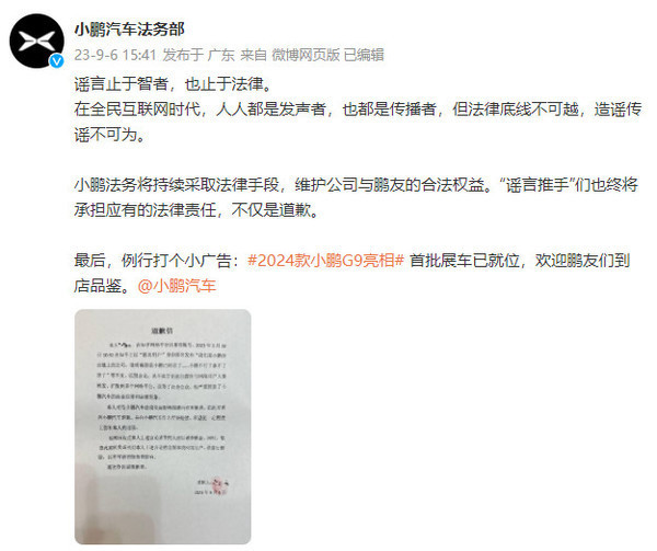 【CNMO新闻】谣言止于智者,也止于法律。9月6日,小鹏汽车官方发布了一网友的“道歉信”。