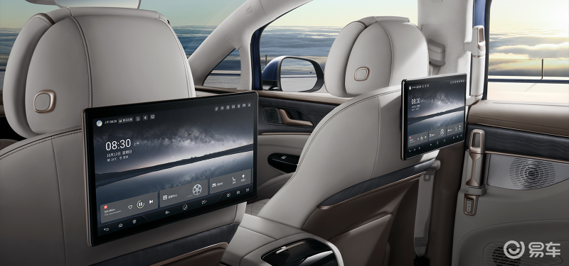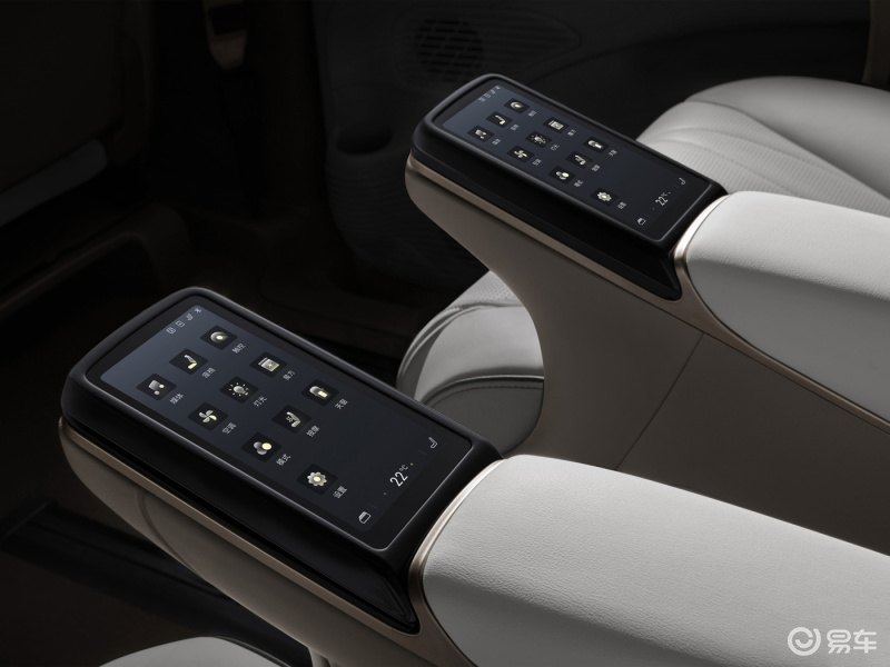 座椅采用菱形纹路,造型贴合人体曲线,注重包裹性,第二排座椅扶手旁设置类似智能手机的独立操作屏,可控制娱乐显示屏以及空调等操作,注重乘坐和娱乐性的需求。