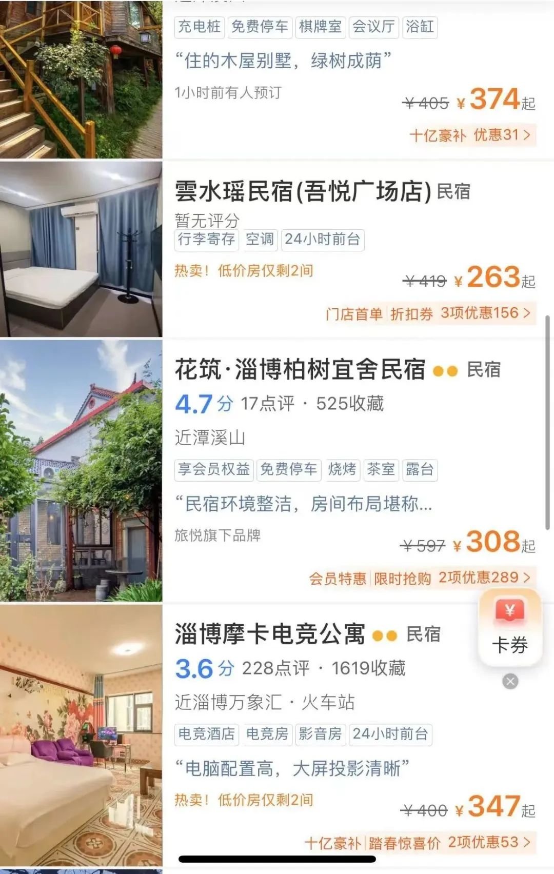 然后就是被突然袭来的游客挤爆的住宿行业:酒店订单暴涨,一房难求。在网上,甚至有“脑子灵活”的网友直接在淄博某医院办理了住院手续。淄博当地居民也充分行动起来,想办法把自家空置的房间出租出去做民宿招待外地游客。