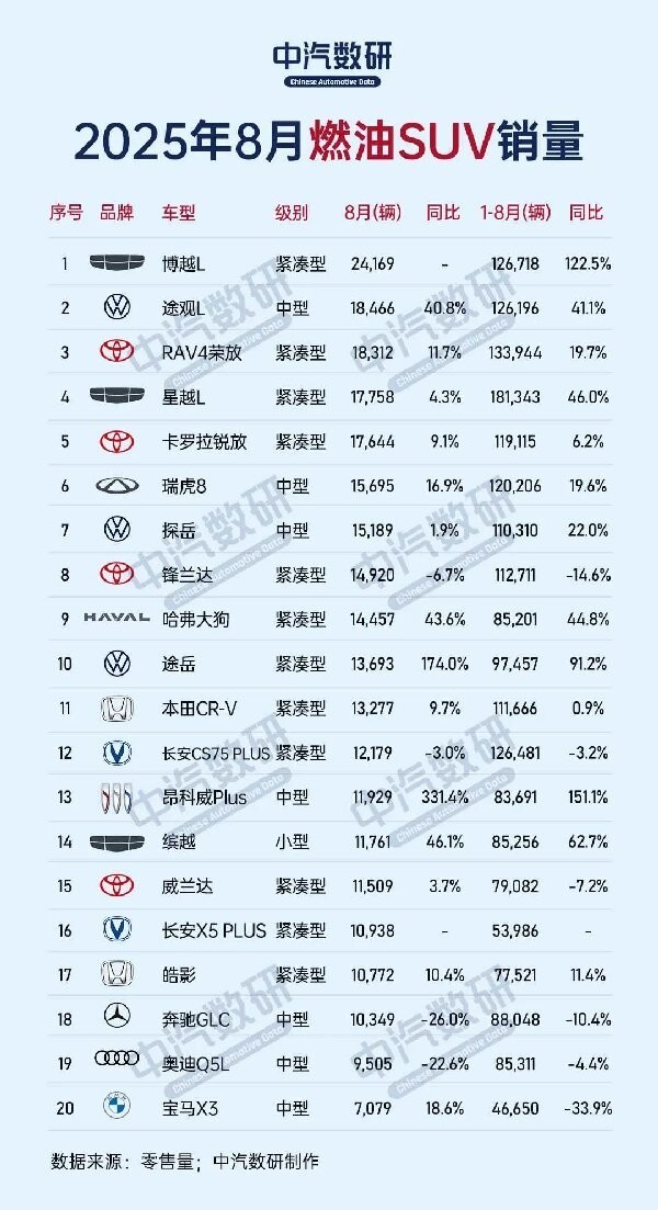 在SUV榜单中,吉利博越L凭借2.4万辆的成绩,获得销量冠军宝座。大众途观L和丰田RAV4荣放以1.8万辆分别排在第二至三名。国产车型吉利星越L以1.8万辆的销量成绩,守住了榜单前五。第六为销量1.8万辆的丰田卡罗拉锐放,而销售了1.6万辆的奇瑞瑞虎8、1.5万辆的大众探岳和丰田锋兰达、1.4万辆的哈弗大狗和大众途岳依次排在第七至十名。