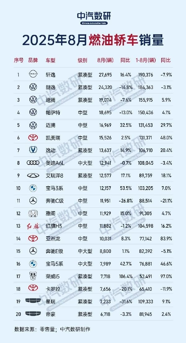 8月燃油轿车销量排名出炉 大众前五占四 国产最高第七
