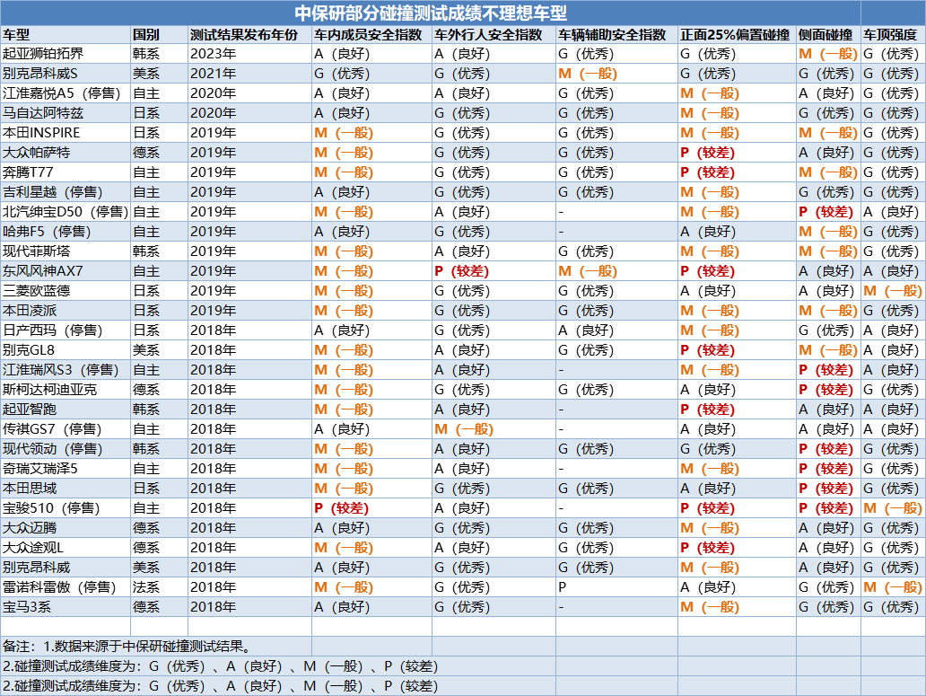 ▲部分获得M(一般)和P(较差)的车型(数据来源:中保研)