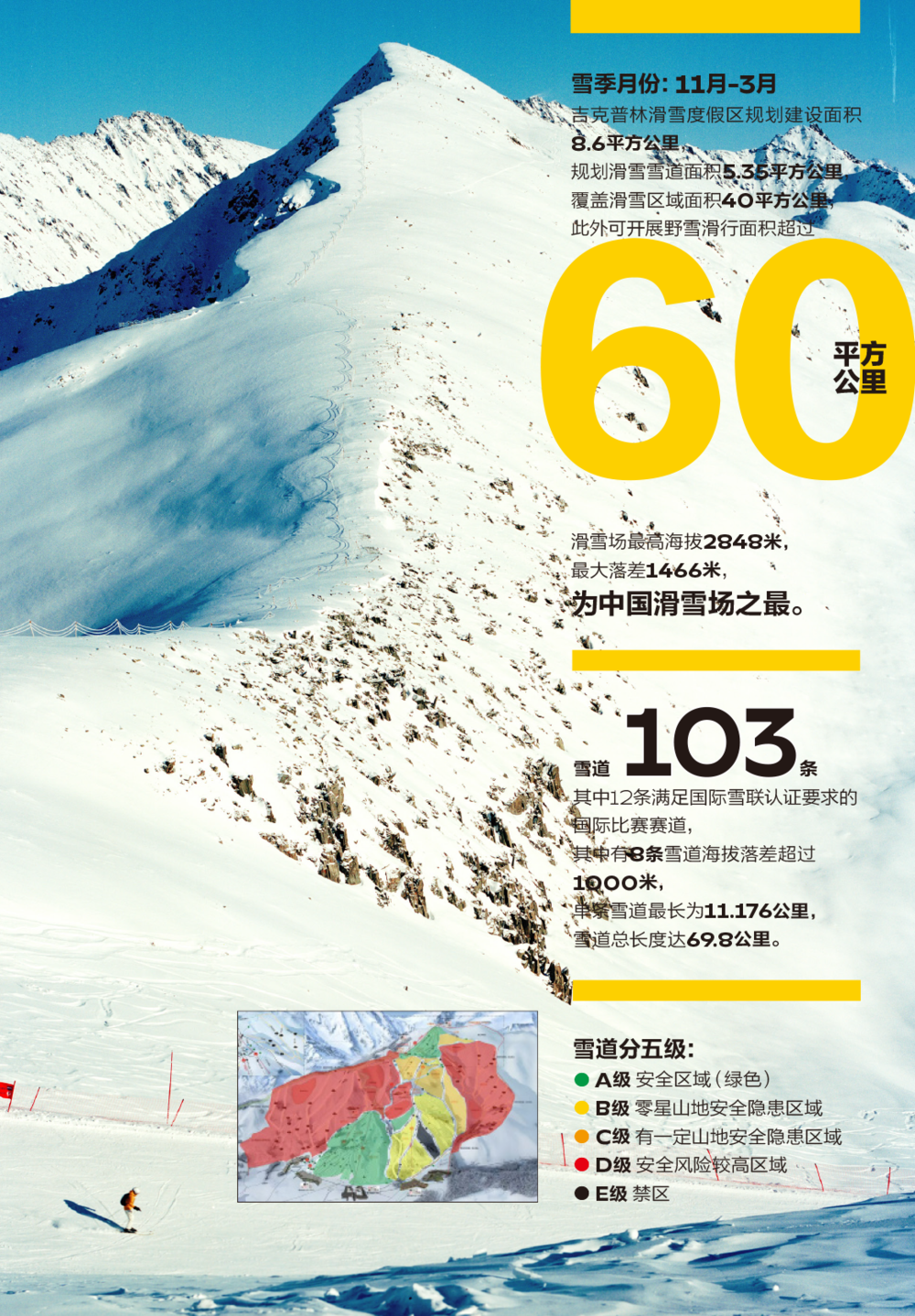 吉克普林滑雪场最高海拔2848米,最大落差1466米,为中国滑雪场之最。