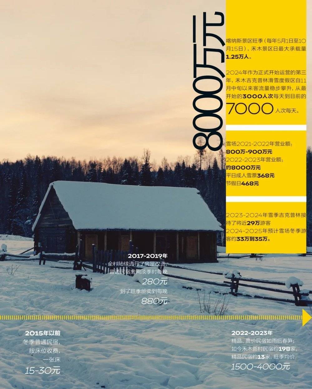 2022年,吉克普林滑雪场的建成不仅提升了禾木的交通条件,增加了旅游设施的配套,越来越多的高收入阶层开始选择禾木作为冬季度假的首选目的地。而随着禾木逐渐进入大众视野,它所吸引的不仅仅是游客,还有商业资本的涌入。