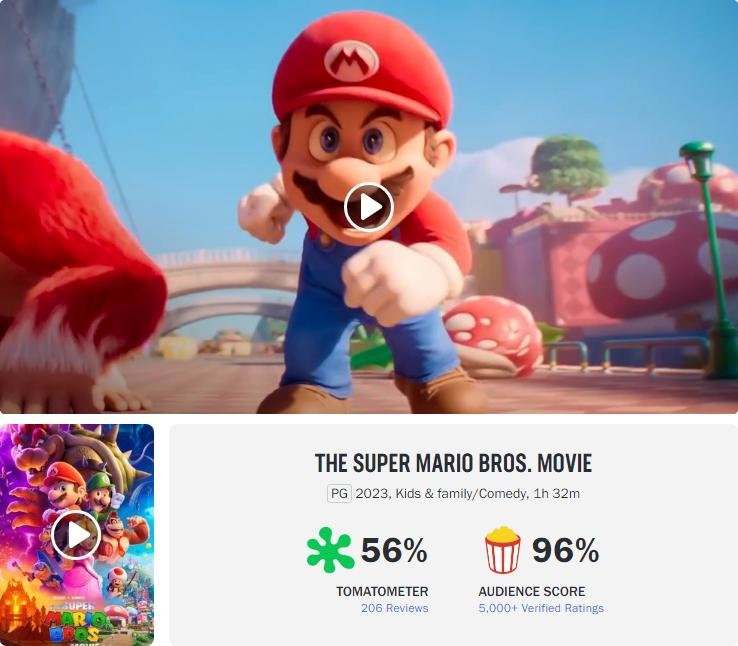 《超级马力欧兄弟大电影》在“烂番茄”上的影评人打分与观众打分呈现两极分化