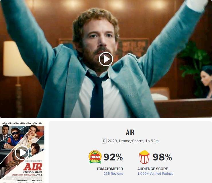 相比之下,同期开映的另一部新片的遭遇则与《超级马力欧兄弟大电影》南辕北辙。来自亚马逊旗下的米高梅影业的《气垫传奇》(Air),在影评网站“烂番茄”上有着高达92%的新鲜度,可以说是博得了专业影评人的一致好评,但五天开画票房只有2020万美元,三日周末票房为1450万美元,恰好都只有《超级马力欧兄弟大电影》的十分之一。