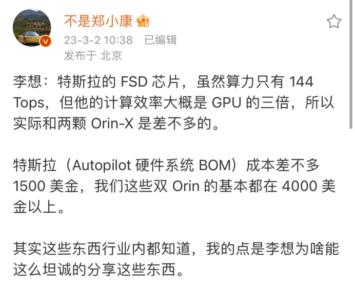 比如,蔚来NT2.0平台选择标配4块Drive Orin芯片,总算力超过1000TOPS,理论上是特斯拉FSD的7倍,要知道,一块Orin的芯片的价格在当时达到400美元左右。
