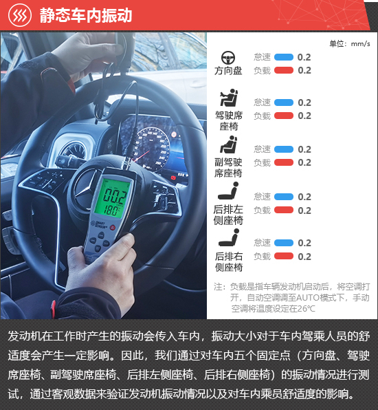 在静态车内振动测试环节,怠速和负载两种状态下,2025款奔驰G500车内各部位的测试数值保持一致,均为0.2mm/s,实测对乘坐舒适性影响不大。