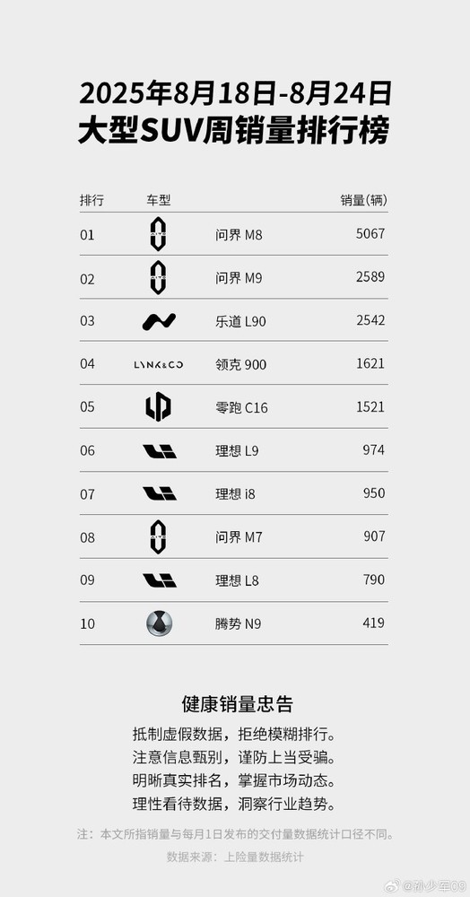 8月26日,有汽车博主曝光了大型SUV最新周(8月18日至8月24日)销量排行。数据显示,问界M8与问界M9分别夺得第一和第二。