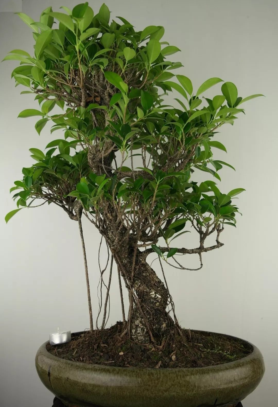 大叶榕其实就是印度榕,它的叶子是特别大,养成盆景后,它的叶子就能越养越小,相对其他的盆景树就大一些。它是特别容易养好的一种盆景,特容易长气根,气根长到土里之后就能长成木质的树干,塑造成盆景就特别灵动、