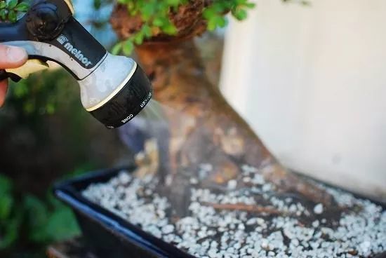 在夏季,下午的时候盆景树很快就干燥了,盆土渗水都成问题,这个时候就要适当浸盆,将盆土浸泡在水里,浸泡10~15分钟,让盆土完全湿润。每次给盆景树浇水一定要注意完全浇透,不能只浇一点水。