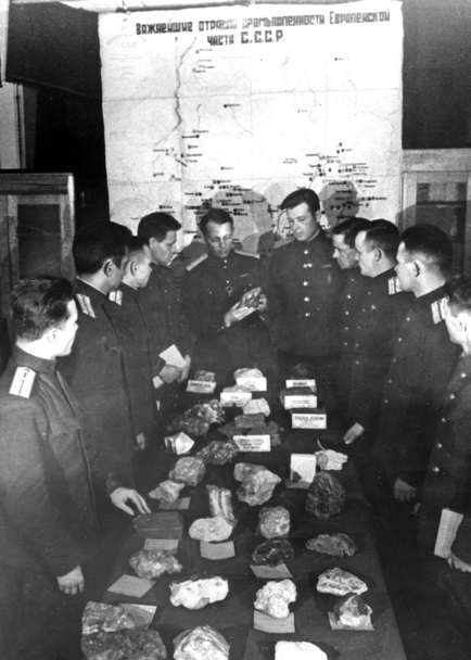 伏龙芝军事学院内正在研究地质学的军官,1945 年摄。教学中,学校大力总结和推广战争经验,并根据战争进展和国情的变化,及时调整教学重点,成为“红军战斗经验贮存库”