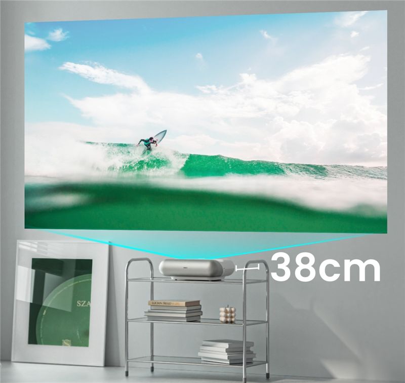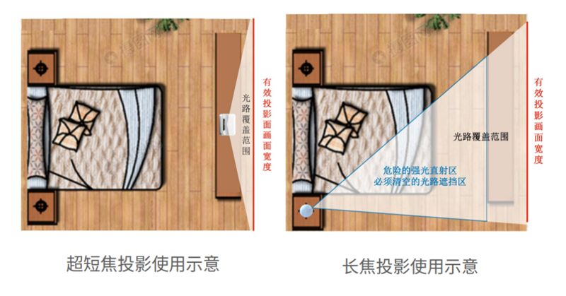 一般普通长焦投影仪需要2.5~3米左右距离,才能投出百吋大屏,对空间大小要求较为苛刻,还要考虑到投影的黄金位置,无法保证画面的正确投射,加上居家环境人员走动,很容易影响投影效果。