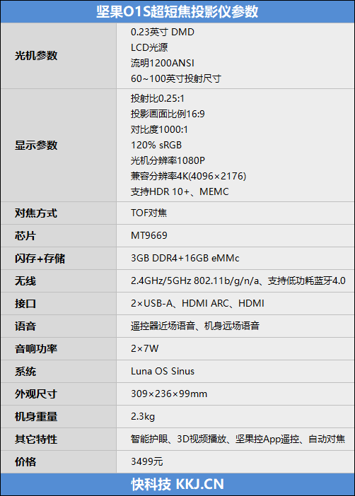 下图为坚果O1S超短焦投影仪的具体参数: