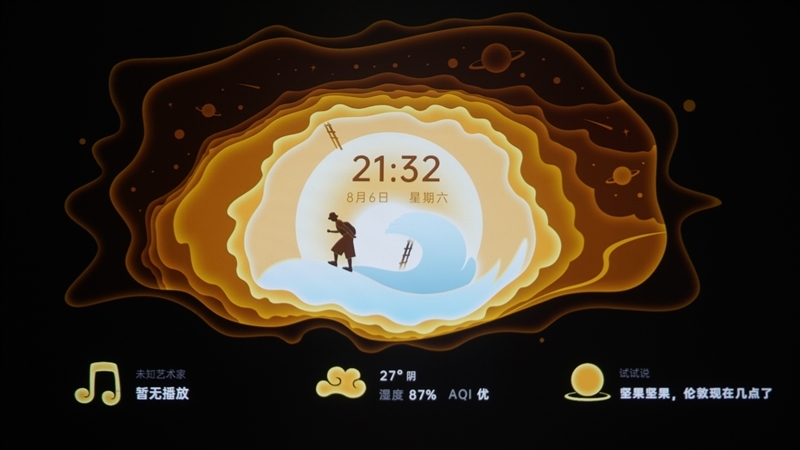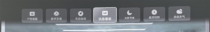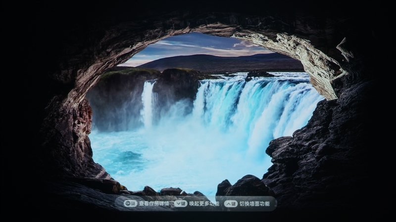 按遥控器上键,可呼出墙面切换,用户可以根据自己的喜好和需求,选择各种自定义墙面,并选择数字艺境、乐动音律、讯息看板、光影节律、悬浮时钟、动态天气等七大场景,非常极具特色。