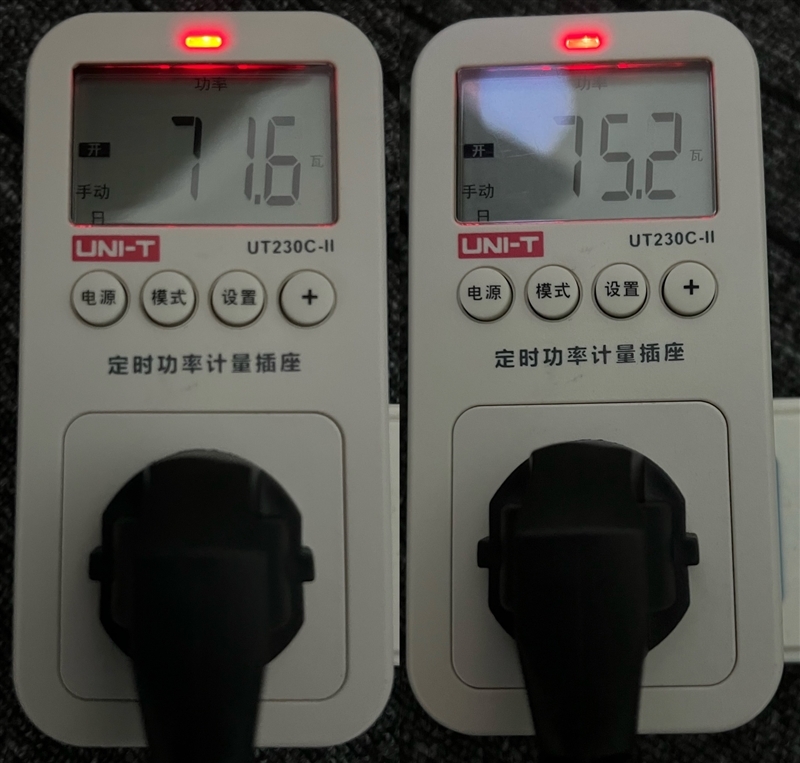 我们也测试了下两者模式之间的差异,坚果O1S在陪伴模式下,功耗在71.6W左右;在普通模式下,待机和观影的功耗都在75.2W左右,比陪伴模式稍高一些。