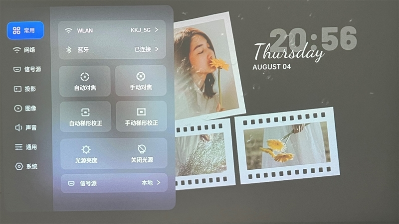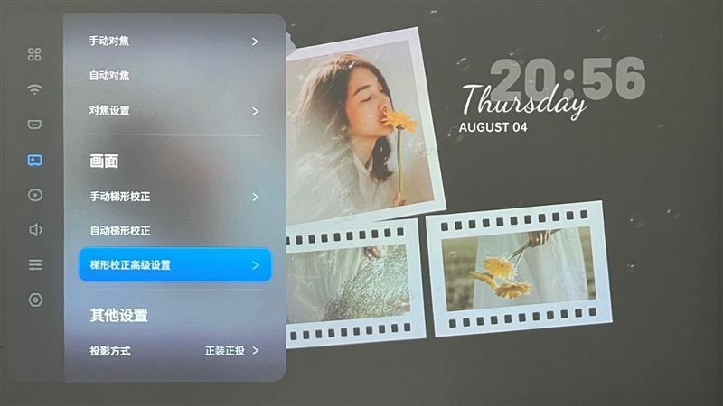 从遥控器呼出设置菜单,可以对投影仪的各项功能进行详细的调节,坚果O1S支持自动对焦和自动梯形校正。