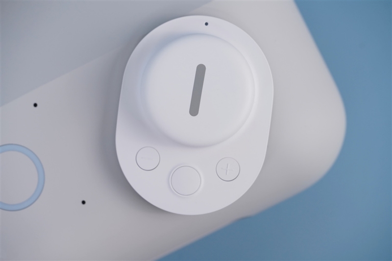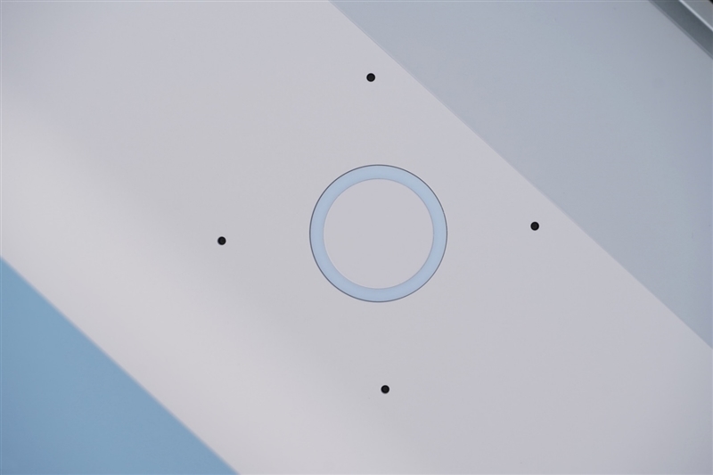 镜头下方是由光圈环绕的触摸按压开关,轻触就能实现开关机操作,开关旁边有4个拾音孔。