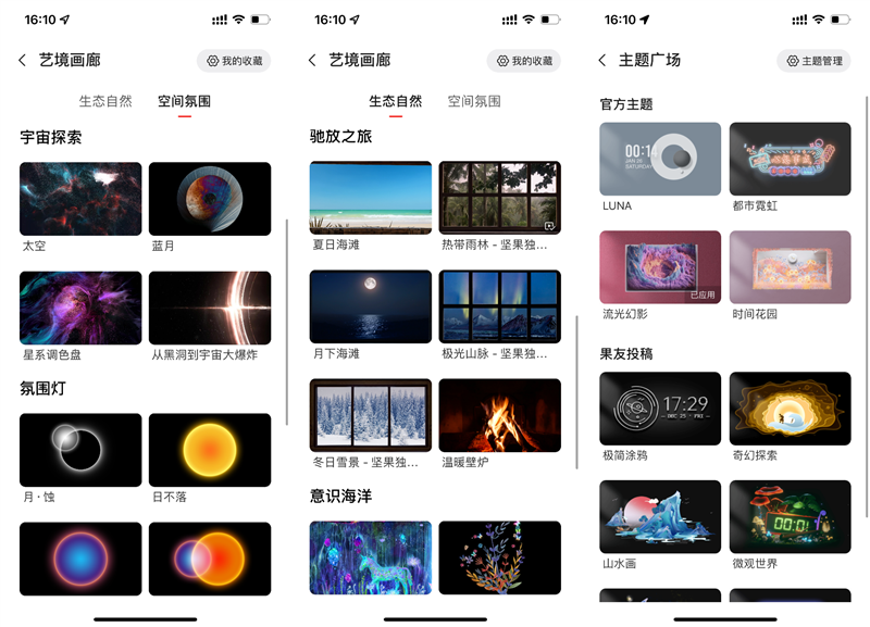 除了预设的以上几个模式,笔者建议用户下载坚果控APP,官方也提供了各种风格的艺术画廊和主题,这里有更多艺术家的作品以供用户选择,让坚果O1S投射出来的画面更有格调。