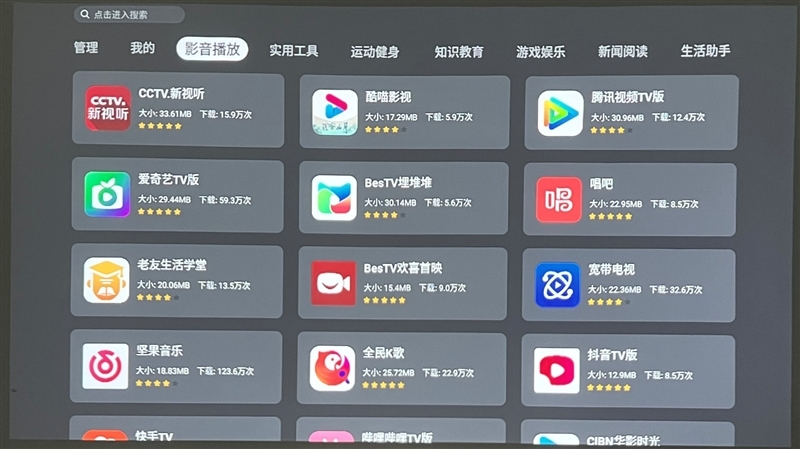 坚果O1S还内置了应用商城,用户也可以下载自己常用的影视APP,比如酷喵影视、腾讯视频、爱奇艺等主流APP,基本不愁没资源看。