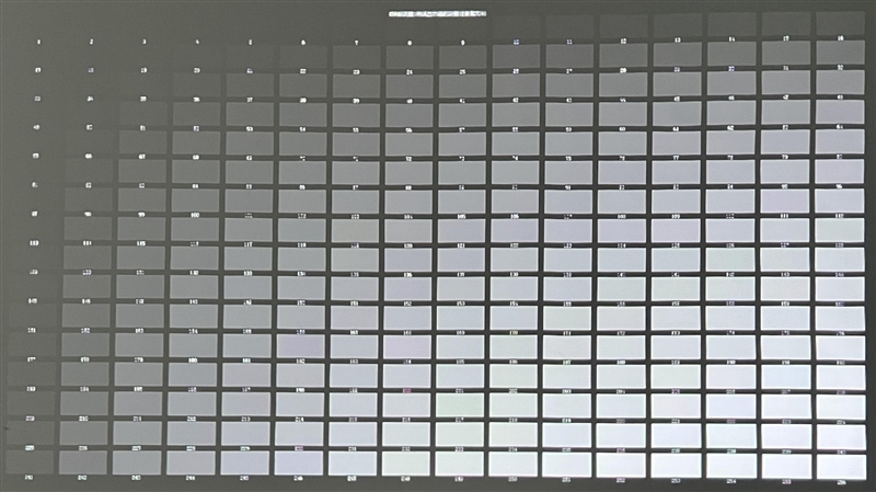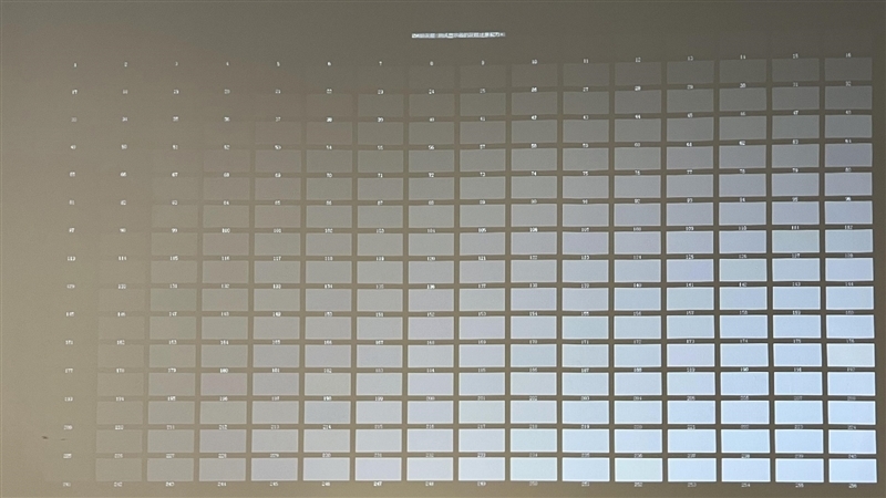 坚果O1S在上图的灰阶测试图中,在室内开灯环境下依稀能识别到黑色色块6,而关灯环境下亮光环境下画面表现更优秀,能够清晰看到黑色色块3或者黑色色块4。