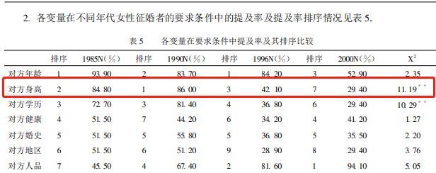 有学者对1985-2000年女性在《中国妇女》杂志上刊登的征婚启事进行了统计,按照每5年抽取1年为取样原则,一共获得了131份女性征婚启事样本。数据发现,从1985年-2000年,男人的身高一直都是女人择偶的一项标准,而且排名不低,1996年之前一直都排在前三位。