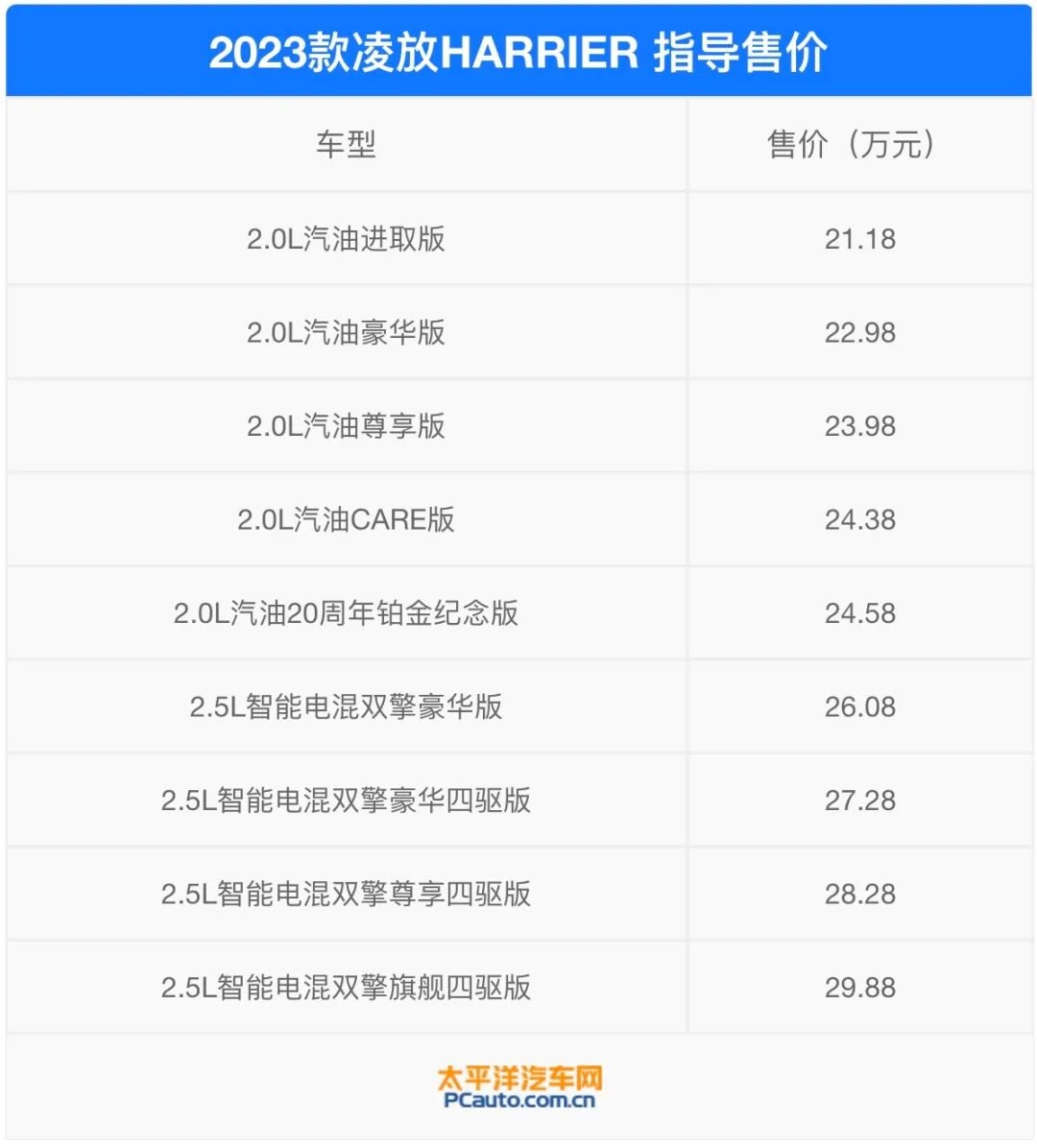 日前,一汽丰田2023款凌放HARRIER正式上市,官方指导价区间为21.18-29.88万元,共推出9款车型。新车主要在配置上进行了升级,同时对产品阵容进行调整,新增3款车型。
