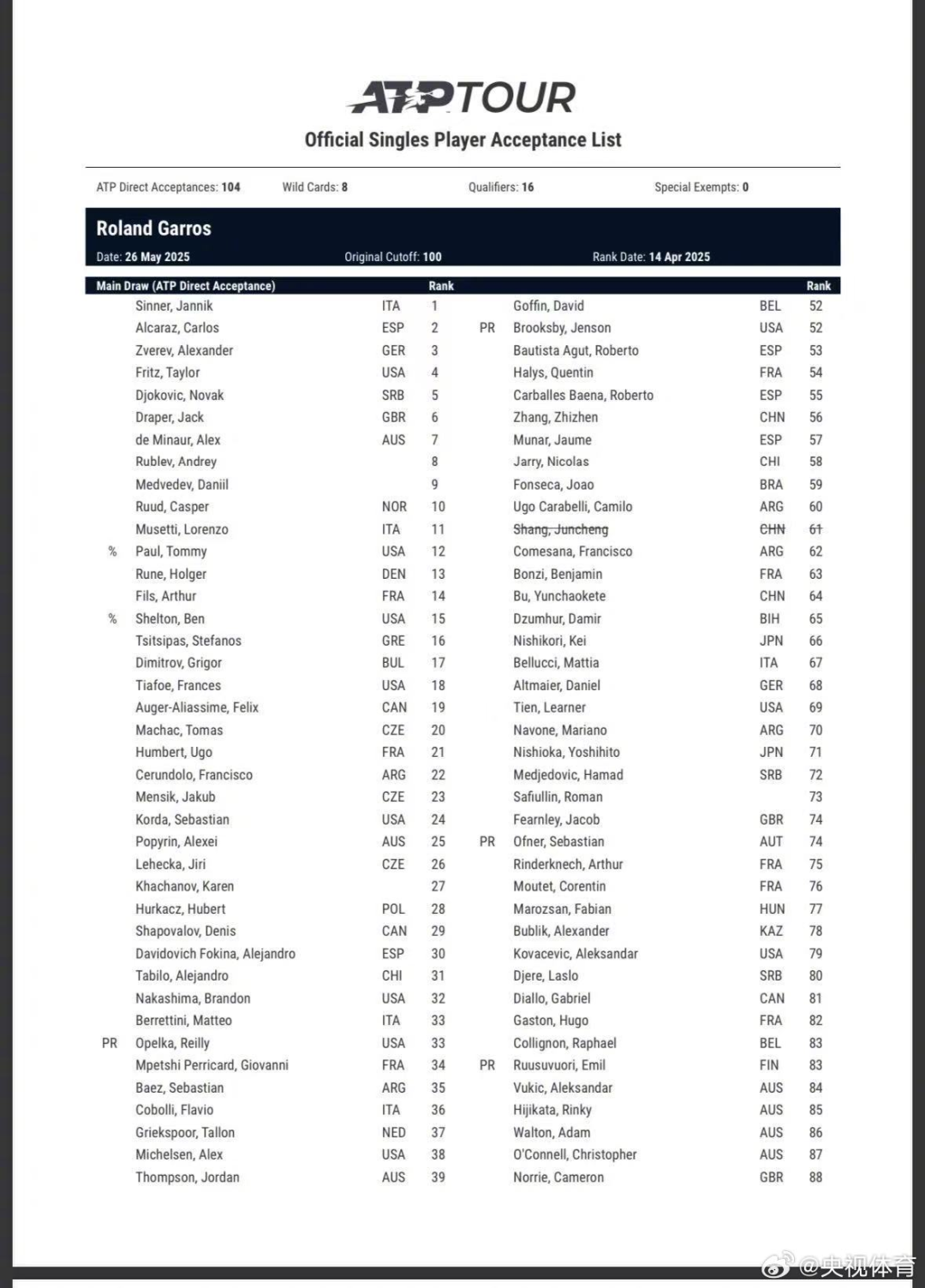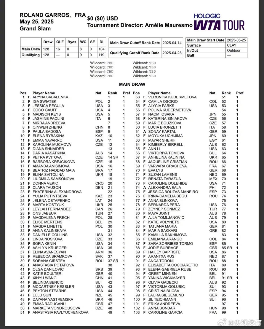 据法网官方,本届比赛卫冕冠军阿尔卡拉斯、斯瓦泰克,男女单世界排名第一辛纳、萨巴伦卡,传奇球星德约科维奇等球员悉数在列。