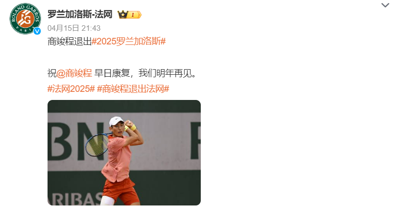 当晚,法网官方发文祝福商竣程早日康复,“我们明年再见。”