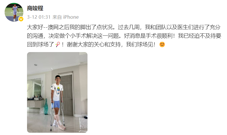 今年3月,商竣程曾在个人社媒发文,称澳网之后脚出了点状况,做了个小手术,手术很顺利!