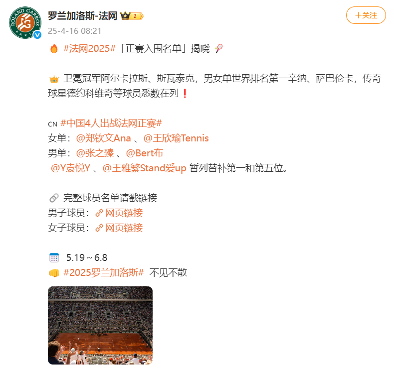 北京时间4月15日,2025法国网球公开赛正赛入围名单公布,中国选手4人在列,分别是郑钦文、王欣瑜、张之臻和布云朝克特。