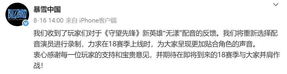 无独有偶,8月《守望先锋》新英雄“无漾”的预告视频发布后,遭到游戏玩家的广泛质疑,原CV赵洋主动请辞,宣布不再担任角色配音工作;暴雪中国也对事件回复,表示会“重新选择配音演员进行录制”。