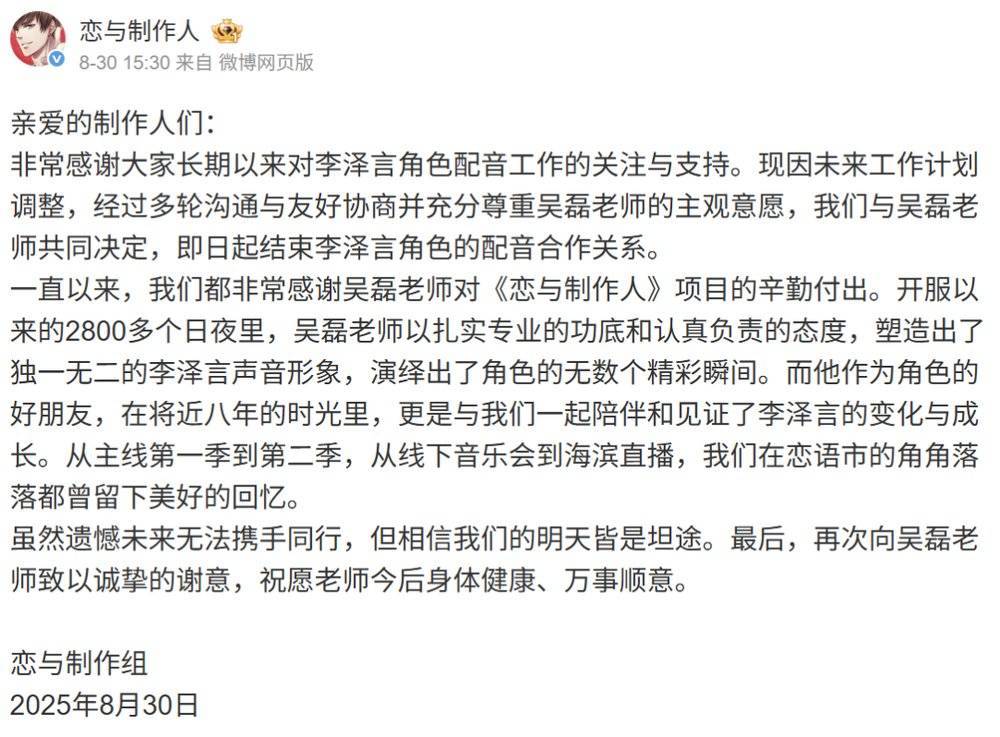 8月30日,《恋与制作人》官方发布消息,宣布与配音演员(下称CV或声优)吴磊结束合作。此前,他担任游戏内角色“李泽言”的配音长达八年。