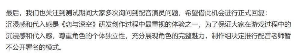 不管怎样去理解,CV的声音毕竟是构成角色的一部分。比起仅仅是为了提升玩家“体验感”或者“代入感”而选择不公布声优,我更倾向于认为,权衡声优带来的宣传流量和长线运营的稳定之后,厂商不希望再因为CV相关问题掀起更多的波澜舆论,导致进一步的损失。