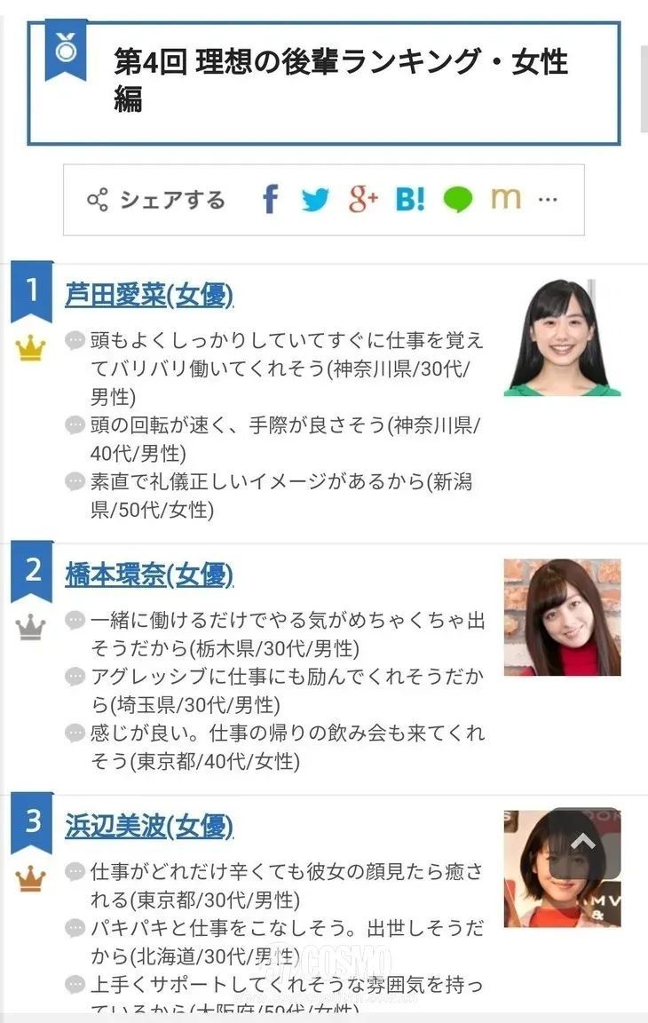 在近年网友票选的“最理想后辈”中,mana酱成为第一位,第二位则是小天使桥本环奈。