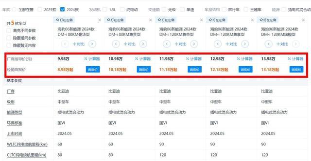 2024款海豹06 DM-i一口价活动分别为80KM豪华型8.98万元、80KM尊贵型10.18万元、120KM尊荣型11.18万元、120KM尊享型12.18万元、120KM旗舰型13.18万元。